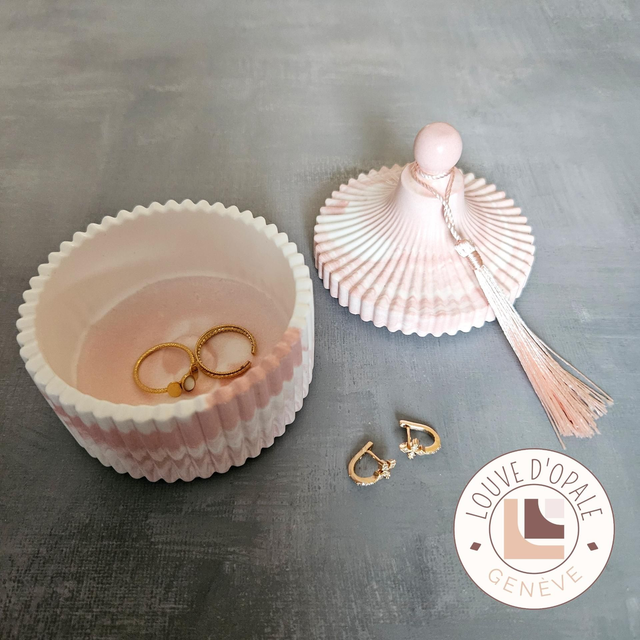 Coffret à bijoux en matière minérale à base de gypse, douce au toucher et à l’aspect pierre naturelle.